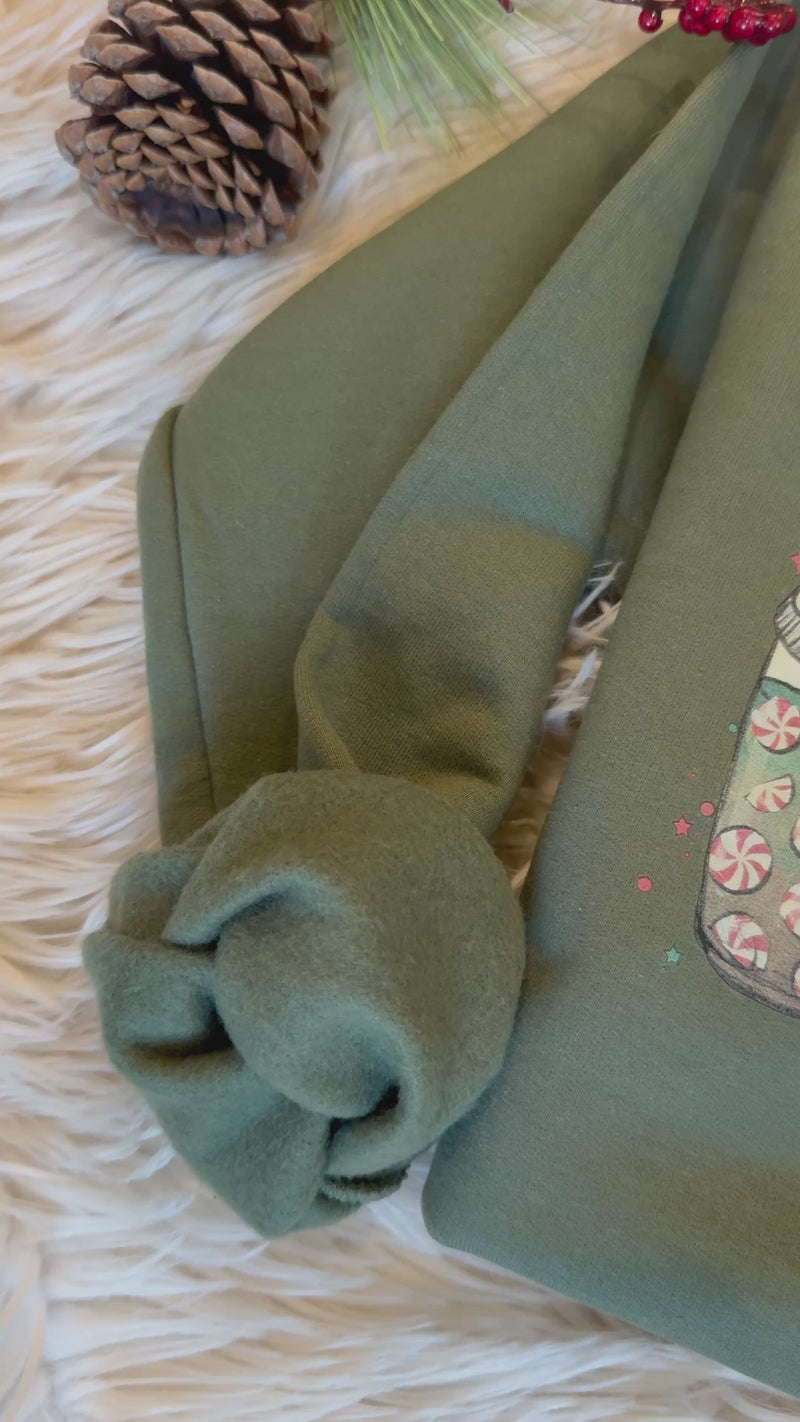 Celebrate the holiday season in style with our Christmas Latte Sweatshirt! This unisex crewneck sweater in dark olive features a vintage-style graphic of delicious Christmas lattes, perfect for staying cozy and spreading cheer. (Don't latte this opportunity pass you by!)